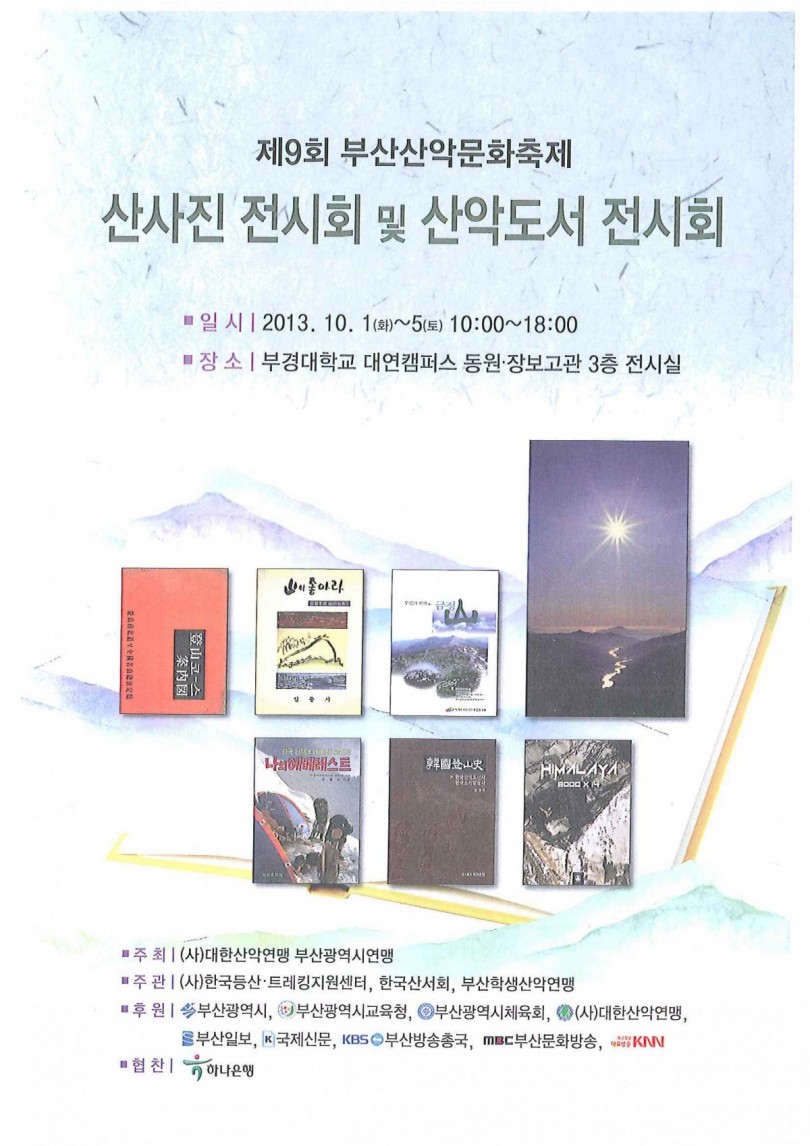 1. 제9회 부산산악문화축제 주요 행사 중 '산사진 및 산악도서 전시회'를 개최하면서 도록(24쪽)을 제작하여