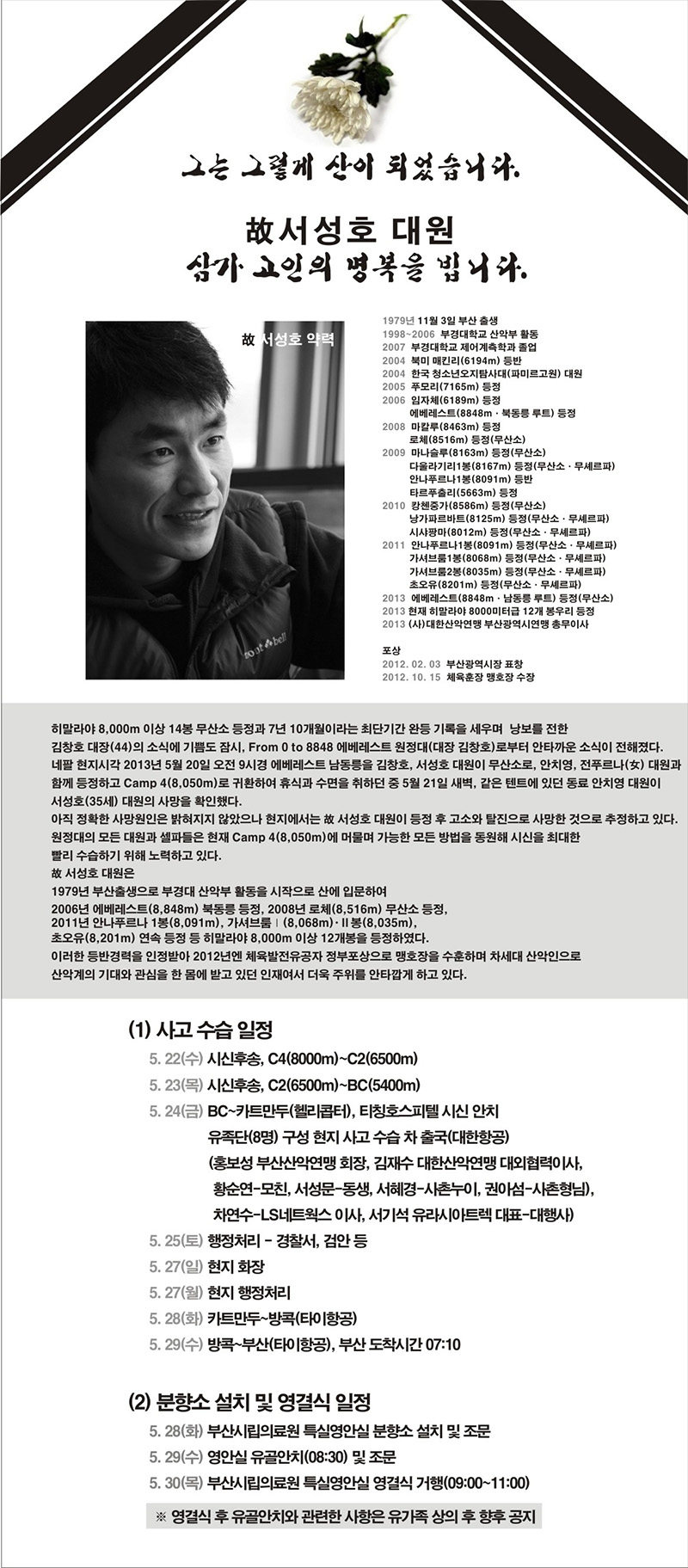 고 서성호 대원 - 삼가 고인의 명복을 빕니다. 작성자 정보 산악연맹 작성 8,332 조회 작성일 2013.05.24 21:07 컨텐츠 정보 본문 SNS 공유 관련자료 이전 "고" 서성호 부산산악연맹 총무이사 부산산악연맹장 추진일정 알림 작성일 2013.05.27 다음 2013 박영석 추모 희망찾기 등반대회 안내 작성일 2013.05.07 댓글 0개 등록된 댓글이 없습니다. 로그인한 회원만 댓글 등록이 가능합니다. 목록