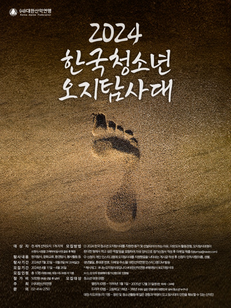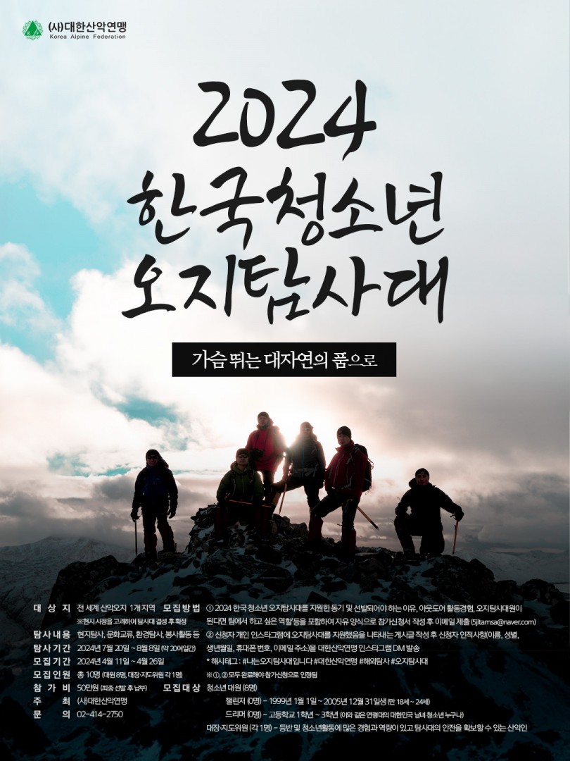 2. 이에 2024 한국 청소년 오지탐사대 추진위원회에서는 한국 청소년 오지탐사대의 발전을 위하여 역량 있는 산악인들과 산악계의 미래를 펼쳐나갈 청소년들을 대원으로 모집합니다.