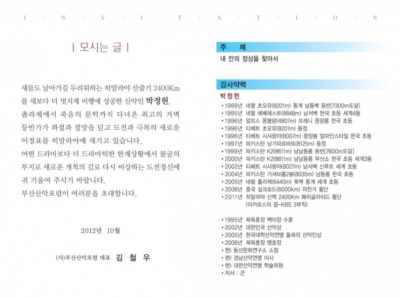 2012년 산악강연회안내 작성자 정보 번개 작성 5,460 조회 작성일 2012.09.25 09:24 컨텐츠 정보 본문 (사)부산산악포럼에서 아래와같이 2012년도 산악강연회를 개최하오니 산악동호인님들의 많은 참석 바랍니다. * 제5회 산악강연회 - 일시 : 2012년 10월11일(목) 19시(1시간) - 장소 : 부산교육대학 소강당 - 강사 : 박정헌 - 주제 : 내안의 정상을 찾아서 SNS 공유 관련자료 이전 제1회 울산광역시 남구청장배 전국 스포츠클라이밍대회 개최안내 작성일 2012.10.17 다음 산악마라톤 답사 작성일 2012.09.08 댓글 0개 등록된 댓글이 없습니다. 로그인한 회원만 댓글 등록이 가능합니다. 목록