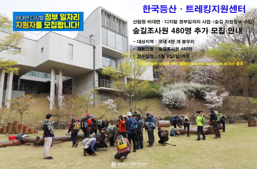 한국등산・트레킹지원센터에서는 비대면 정부일자리 사업의 일환으로 국내 4천 개 봉우리를 대상으로 ‘숲길 자원정보 수집’ 업무를 수행할 숲길조사원 480명을 2차로 오는 5월 9일(일)까지 추가로 채용합니다.